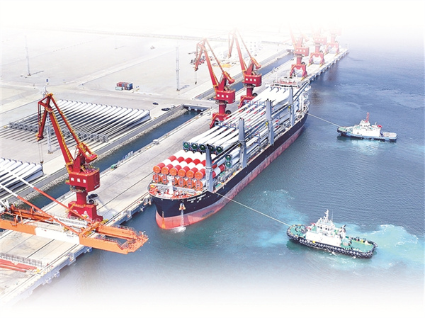 裝載12套風(fēng)電整機(jī)設(shè)備的全球最大多用途重吊船“明興”輪在江蘇南通通州灣呂四起步港區(qū)“2+2”通用碼頭啟航駛往智利。圖片來(lái)源:視覺中國(guó)