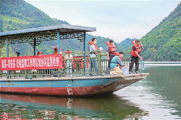 浙江省淳安縣、安徽省歙縣兩地紀(jì)委監(jiān)委會(huì)同環(huán)保部門在新安江浙皖交接斷面鳩坑口水域?qū)λ幢Wo(hù)、水質(zhì)監(jiān)測(cè)等情況開展聯(lián)合監(jiān)督檢查。謝航凱 攝