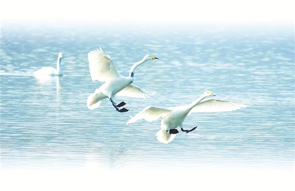 圖③:位于山西省運城市的平陸縣黃河濕地生態環境持續向好,吸引眾多鳥類前來棲息。圖為白天鵝在濕地嬉戲。 圖片來源:視覺中國