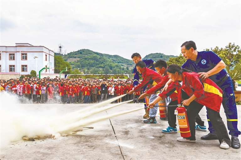 近日,各地開展形式多樣的防災減災知識普及和應急疏散演練等活動,提高人們應急避險與安全自救能力。圖為藍天救援隊隊員在貴州省黔西市錦星鎮第二小學指導學生使用滅火器。 新華社發(范暉 攝)