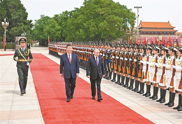 5月16日上午,國家主席習近平在北京人民大會堂同來華進行國事訪問的俄羅斯總統普京舉行會談。這是會談前,習近平在人民大會堂東門外廣場為普京舉行隆重歡迎儀式。新華社記者 饒愛民 攝