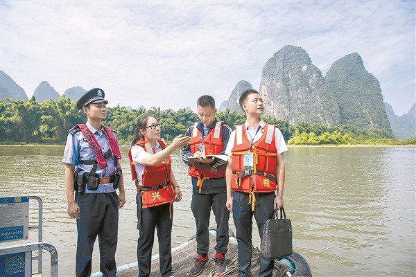 圖為廣西壯族自治區(qū)桂林市紀檢監(jiān)察干部在陽朔縣興坪鎮(zhèn)檢查漓江流域生態(tài)環(huán)境保護突出問題整治情況。 夏立慧 攝