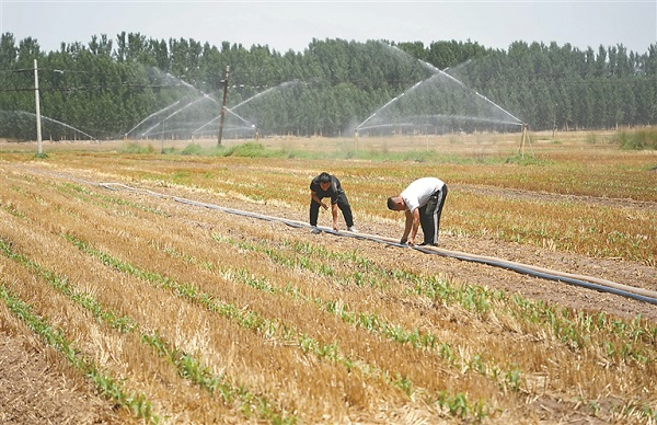 入夏以來,山東省持續高溫少雨,多地旱情加劇。針對旱情,山東各地采取擴大引黃水量、推廣節水灌溉、增加農用機電井等辦法,積極抗旱保夏種。圖為近日,在臨邑縣孟寺鎮,村民在鋪設灌溉用管道。 新華社記者 徐速繪 攝