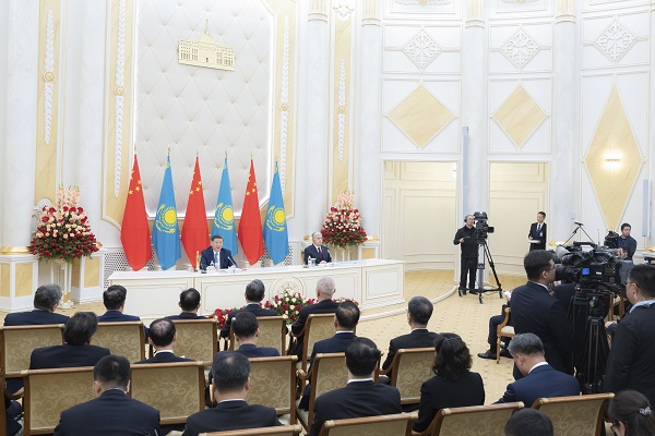 習近平指出,這是我第五次訪問友好鄰邦哈薩克斯坦,也是我同托卡耶夫總統時隔9個月再次會晤。剛才我同托卡耶夫總統舉行了親切友好、富有成果的會談,達成廣泛共識,共同簽署了《中華人民共和國和哈薩克斯坦共和國聯合聲明》,共同規劃兩國未來合作重點方向,我們還見證交換了兩國多項政府間、部門間合作文件,涉及經貿、互聯互通、能源、農業、科技、人文等重點領域,為中哈關系高質量發展注入新動力。