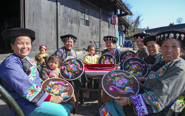 湖南湘西十八洞村村民展示苗繡產品。龍艾青 攝