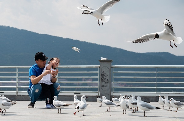 游人在昆明海埂大壩觀賞紅嘴鷗。新華社記者 王冠森 攝