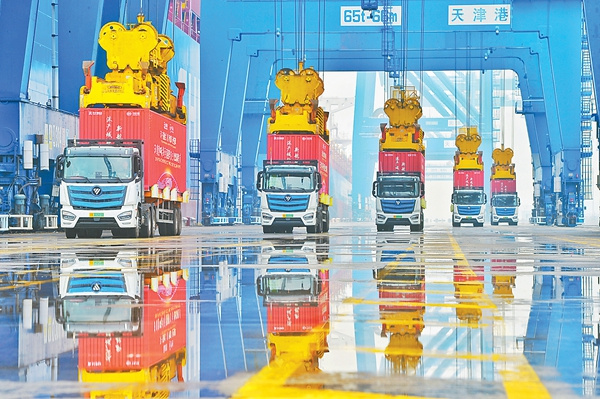 京津冀協(xié)同發(fā)展十年來,天津港集裝箱吞吐量從1300多萬標箱增加到2218萬標箱,航線從119條增加到145條,泊位從159個擴充到213個,躋身世界十大港口之列。三大指標躍升背后,是生動的港區(qū)之變、協(xié)同之變。圖為近日,在天津港集裝箱碼頭,吊車將京津冀等地區(qū)的貨物吊裝至“中遠海運阿根廷”輪。