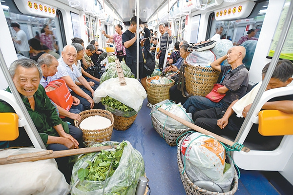 推進社會體制改革意味著要聚焦民生關切,兜住兜牢民生底線。在重慶,有一條“背簍專線”。連接渝北區(qū)石船鎮(zhèn)和市區(qū)的軌道交通4號線開通后,不少老鄉(xiāng)背著背簍、搭地鐵去城里賣菜。圖為近日,菜農(nóng)乘坐重慶軌道交通4號線前往市區(qū)賣菜。 圖片來源:視覺中國