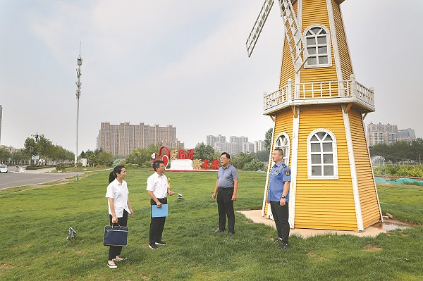經過治理,山西省臨汾經濟開發區多年的荒地變身園林景觀。圖為近日,當地紀檢監察干部對整改情況進行現場核查。 史曉巖 攝