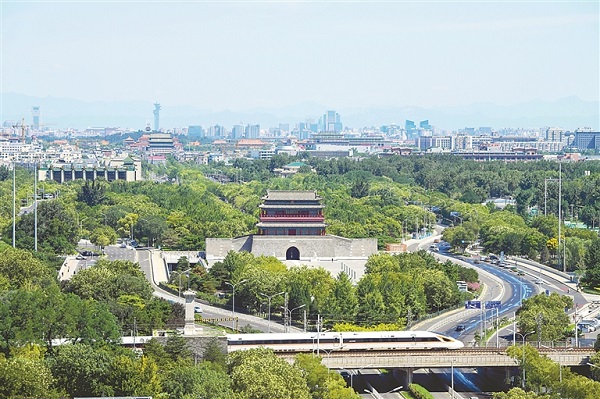 北京中軸線縱貫北京老城南北,始建于13世紀,形成于16世紀,此后經不斷演進發展,形成今天全長7.8公里、世界上最長的城市軸線。圖為一列復興號高鐵列車駛過北京永定門城樓前。 新華社記者 鞠煥宗 攝