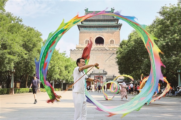 北京中軸線鐘鼓樓廣場,市民在歡快的樂曲聲中舞動起龍形彩綢。 圖片來源:視覺中國