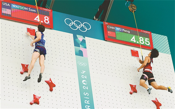 在巴黎奧運會攀巖男子速度賽比賽中,中國選手伍鵬獲得銀牌。圖為8月8日,中國選手伍鵬(右)與美國選手沃森在巴黎奧運會攀巖男子速度賽半決賽中。 新華社記者 高靜 攝
