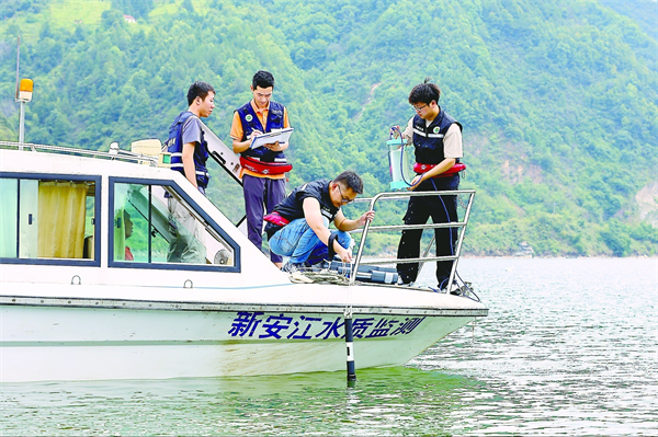 在安徽省黃山市歙縣街口鎮(zhèn),來自安徽省黃山生態(tài)環(huán)境監(jiān)測(cè)中心和浙江省杭州生態(tài)環(huán)境監(jiān)測(cè)中心的工作人員在新安江流域跨省界斷面采集聯(lián)測(cè)水樣,實(shí)時(shí)監(jiān)測(cè)水質(zhì)動(dòng)態(tài)。 新華社發(fā)(樊成柱 攝)