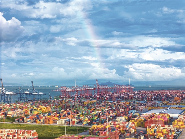 圖為近日,廣州南沙港碼頭,深中大橋雨后現(xiàn)絢麗彩虹。
