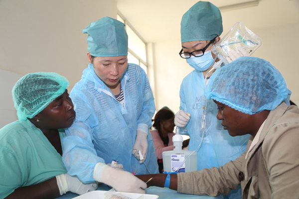 圖為在塞拉利昂首都弗里敦,中國人民解放軍援助西非抗擊埃博拉疫情醫療隊為中塞友好醫院開展輸液培訓活動。 新華社發(戴欣 攝)