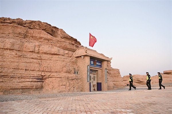 甘肅省敦煌市公安局雅丹國家地質公園景區治安派出所,地處“死亡之海”羅布泊東南邊緣地帶、雅丹國家地質公園內,是中國唯一一個“挖”出來的大漠“窯洞派出所”。圖為敦煌雅丹派出所民輔警日常檢查結束后走進“窯洞”。 圖片來源:視覺中國