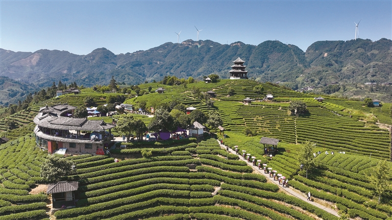 國慶期間,地處湘、滇、桂交界處的廣西三江縣布央仙人山茶園推出系列游園活動。圖為近日,游客在布央仙人山茶園游玩。 新華社記者 張愛林 攝