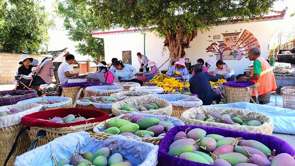 時下,走進大姚縣灣碧鄉,漫山遍野的芒果林便撞入眼簾。微風拂過,油綠的芒果樹葉層層翻涌,宛如綠浪輕搖。在這蔥蘢的枝葉間,金黃色的花朵星星點點、若隱若現,馥郁的芬芳裹挾在風中,悠悠襲來,引得成群的蜜蜂穿梭忙碌。湛藍的金沙江水在陽光的輕撫下波光粼粼,江波瀲滟與翠綠芒果林相互映襯,勾勒出一幅充滿生機的山水田園畫卷。